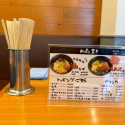 店内は白基調で広々として落ち着いた、今日現在2人掛けテーブル席が7卓ありお水は厨房前セルフ台の上のお水ピッチャーからセルフ(席下に荷物カゴ、左側奥にお手洗いあり)。